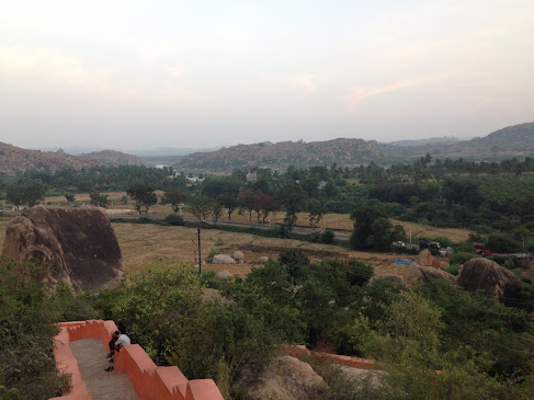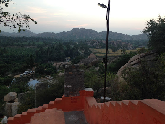Вид з пагорба дивовижний. Плями рисових полів схожі на головоломки, а кокосові плантації та руїни Хампі окреслюють обрій. Дивлячись звідси на руїни, розумієш, чому люди обрали це місце своєю столицею. Навколо круті скелясті гори, що огинають потужну річку Тунгабадра. Це було природне та стратегічно важливе місце для столиці